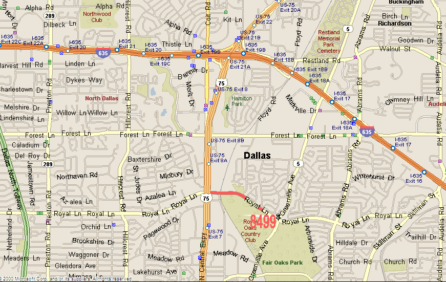 If you are coming north on 75, take the Royal Lane exit and turn right at the light at Royal Lane. Continue straight on Royal Lane for 1 mile.